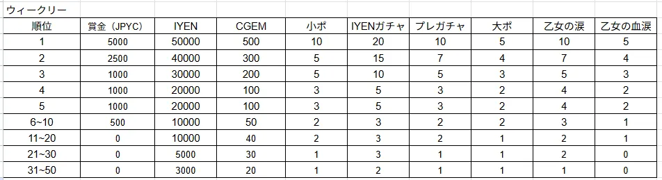 現在、ランキングステージに挑戦しているプレイヤーはまだまだ少ないため、どんなに悪いスコアでも50位以内の報酬を狙うことができる。つまり、毎日少なくとも3,000IYENが獲得できる。これにバトルパスのノーマル報酬を組み合わせることで、早期に1体のキャラをステージ1をクリアできるのに必要十分なステータスに強化できる。