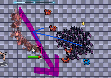 また、コウモリの集団相手には、向かってくる方向に垂直に動くだけで一網打尽にできるため、序盤~中盤の経験値集めを安定させることにも向いている。