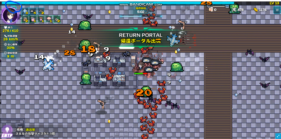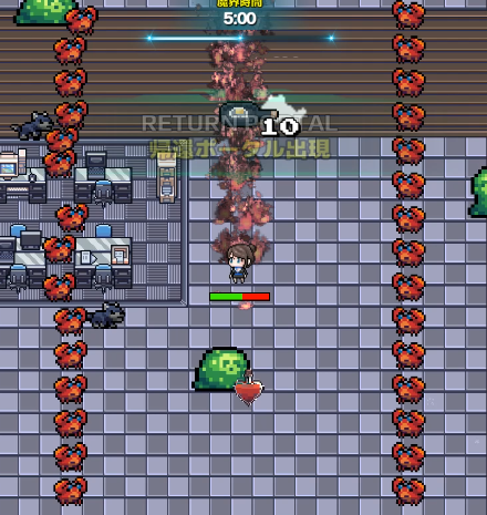 特徴:再び赤蟹の包囲攻撃。ポータルで脱出できると油断してると命取りに。10分生存を目指すなら、全方位から押し寄せるコウモリをしっかり倒して経験値を回収したい。