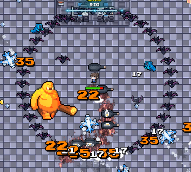 特徴:やや耐久のある敵が出始め、数での押しも強くなってくる。ただし敵の移動はまだ遅めなので、常に動き続けて囲まれないようにすれば突破可能。経験値集めの観点からコウモリの集団は全て倒すのが理想。