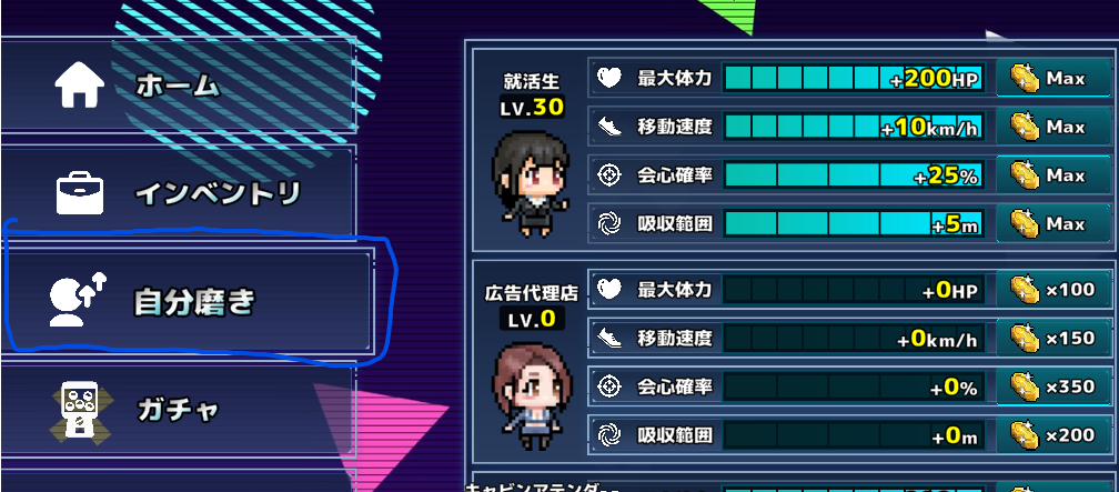 ステータスは、「最大体力」「移動速度」「会心確率」「吸収範囲」の4つを強化できる。