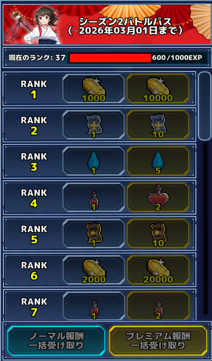 ノーマル報酬の場合は、少なくとも1体のキャラはカンストできる。プレミアム報酬込みだと約8体のキャラをカンストできる。また、EPICチケットや、プレミアムガチャ券など良いキャラや装備を効率的に入手できるアイテムも提供されている。